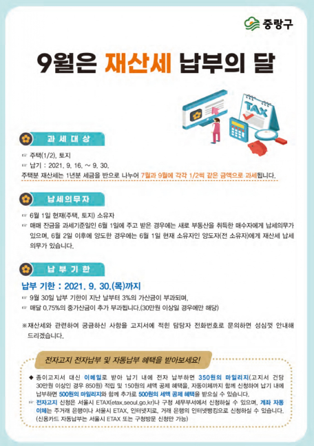 [우리집신문=홍길동 기자] 중랑구가 9월 정기분 재산세 529억원을 부과하고 30일까지 납부 받는다고 밝혔다. 재산세는 매년 6월 1일 기준 보유하고 있는 주택, 건축물, 토지 등 소유자에게 부과되는 지방세다. 7월에는 주택분 절반과 건축물분 재산세가, 9월에는 주택분 나머지와 토지분 재산세가 부과된다. 이번 9월분 재산세는 전년 대비 약 32억원이 증가한 529억 원(134,479건)으로, 6.6% 증가한 액수다. 구는 주택 및 토지 공시지가 상승이 재산세 증가에 영향을 미친 것으로 파악하고 있다. 특히 올해는 코로나로 어려운 주민들의 부담을 덜기 위해 공시가격 9억 원 이하 1세대 1주택자에 재산세율 특례를 적용해 구간별로 0.05%p씩 세율을 인하했다. 재산세는 온오프라인에서 모두 납부 가능하다. 서울시 ETAX, 스마트폰 앱 ‘서울시 세급납부(STAX)’를 이용하면 은행 방문 없이 간편하게 납부할 수 있다. 또한 금융기관 창구, 현금자동지급기, 가상계좌, 거래은행 홈페이지, ARS, 신용카드 결제 등을 통해서도 납부 가능하다. 구는 지난 10일 고지서를 발송했으며, 분실하거나 받지 못한 경우 가까운 구청 세무부서나 동 주민센터에서 재발급 받을 수 있다. 아울러 종이고지서 대신 전자고지서를 받고 기한 내 납부하면 150원의 세액공제와 350원의 마일리지 적립 혜택을 제공한다. 자동이체까지 함께 신청하면 500원의 추가 세액공제와 함께 마일리지 500원을 적립받는다. 마일리지는 세금납부, 교통카드 충전 등에 사용할 수 있다. 납부기한이 지나면 3%의 가산금이 부과되며, 재산세액이 30만원 이상인 경우에는 내달 31일까지 미납 시 매월 0.75%씩 중가산금도 추가된다. 재산세 납부에 관해 궁금한 사항은 중랑구청 세무1과로 문의하면 자세한 안내를 받을 수 있다. 류경기 중랑구청장은 “재산세는 구의 지역발전과 구민 복지 등 꼭 필요한 곳에 사용되는 소중한 자주재원”이라며, “납부기한을 놓치면 가산금이 추가로 부담되는 만큼 30일까지 자진납부 해주시길 바란다”고 말했다. <저작권자 ⓒ 옆집신문 무단전재 및 재배포 금지>