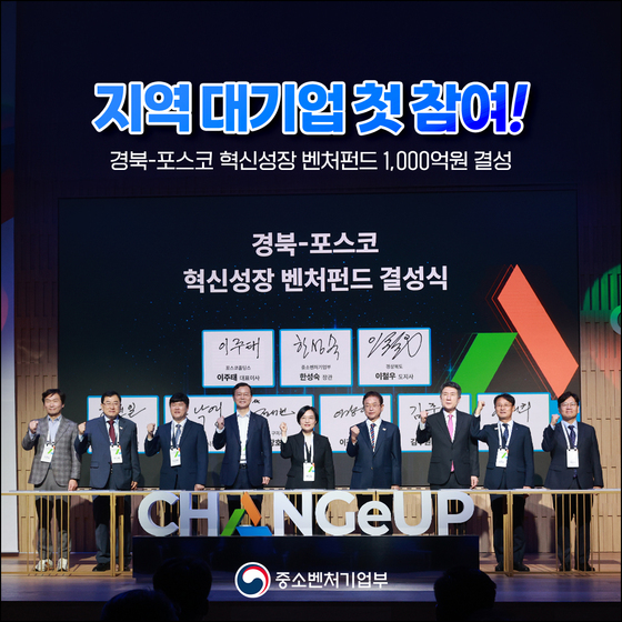 중소벤처기업부는 22일 경북 포항 체인지업 그라운드에서 열린 '경북-포스코 혁신성장 벤처펀드' 결성식에서 경북펀드가 출자자 모집을 완료하고 본격적인 운영에 나선다고 밝혔다.