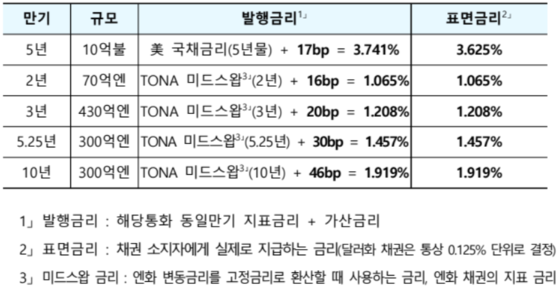 이번 외평채는 5년 만기 달러화 표시 채권 10억 달러와 2년·3년·5.25년·10년 만기 엔화 표시 채권 1100억 엔으로 나눠 발행했다.